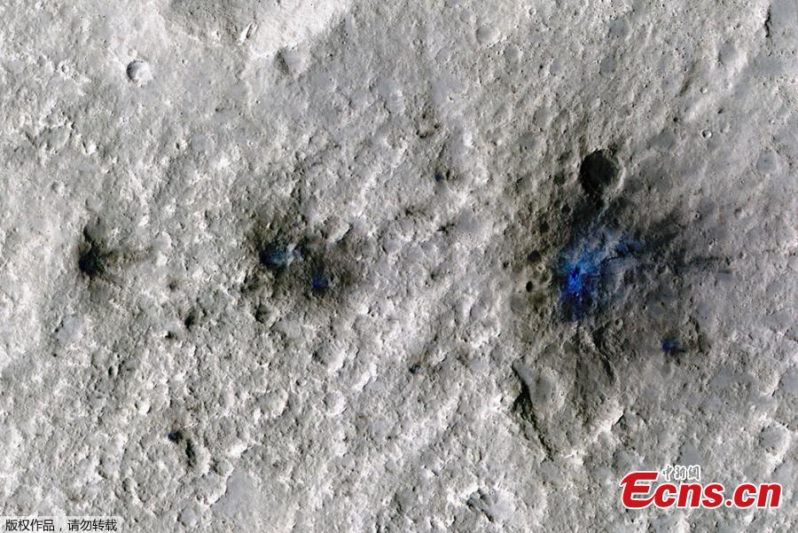 Photo released by NASA on Sept. 20, 2022 shows a meteor strike formed the large blue crater on Mars. These craters were formed by a meteoroid impact on Mars on September 5, 2021, the first to be detected by NASA’s InSight. (Photo/Agencies)