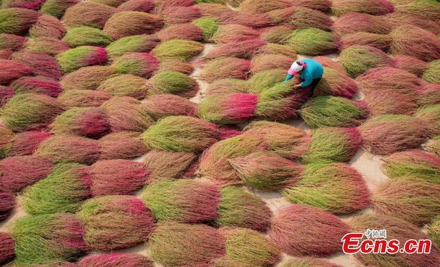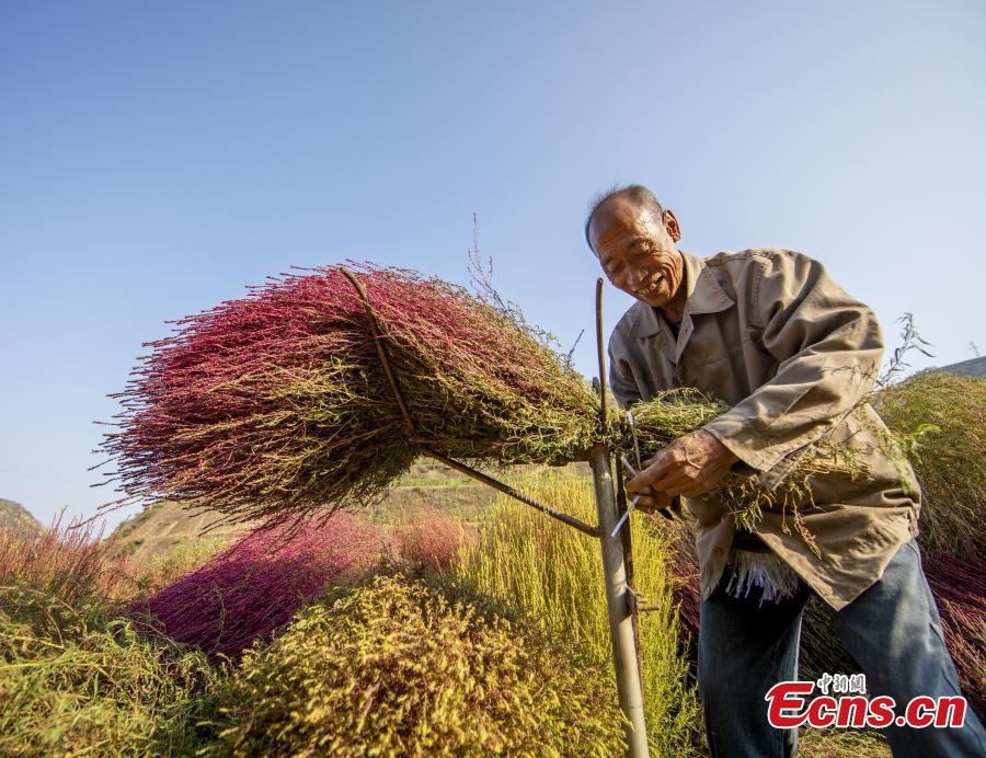 Farmers are busy harvesting the Kochia scoparia, or red broom grass, in Caojiagou village of Liulin county, north China's Shanxi Province. The broom grass turns to bright red color in autumn and can be used to make brooms after it is dried. (Photo: China News Service/Wang Fengyun)
