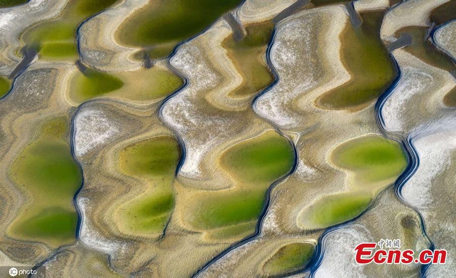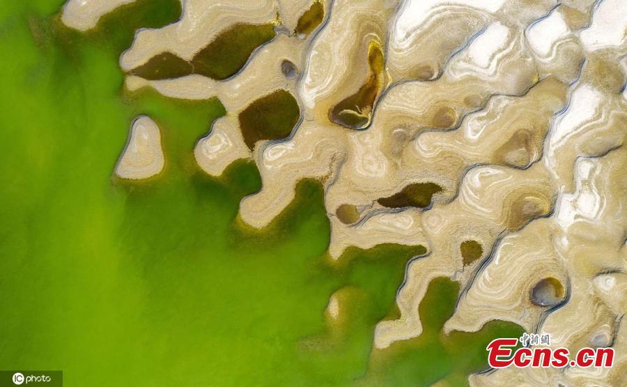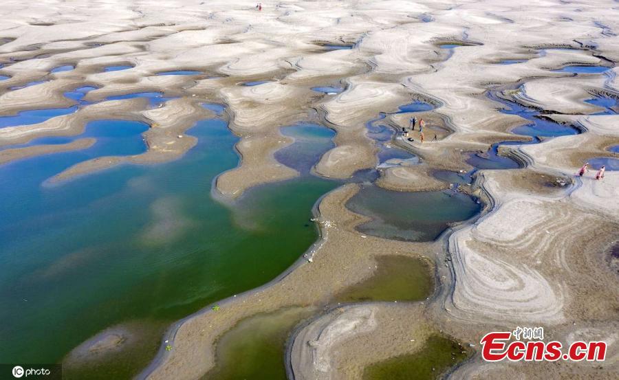 Tidal flats are exposed as a result of falling water levels at Tianxingzhou Island, creating a unique scenery in Wuhan, central China's Hubei Province, Sept. 21, 2022. (Photo/ICphoto)