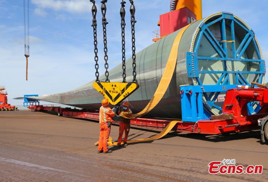 The single mass of the giant wind turbine blades weighs 62 tons and will be transported to Yancheng City of the province for trial run.