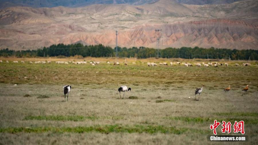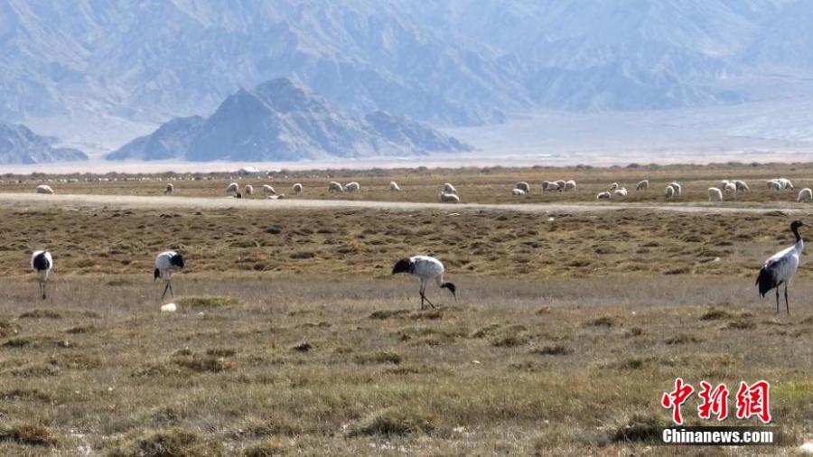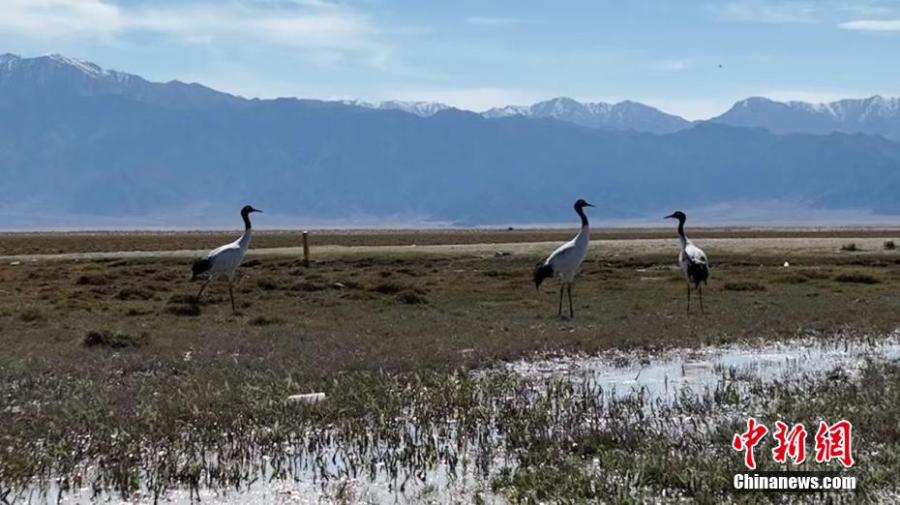 Black-necked cranes wander at a wetland in Qaidam Basin, northwest China's Qinghai Province. (Photo provided to China News Service)