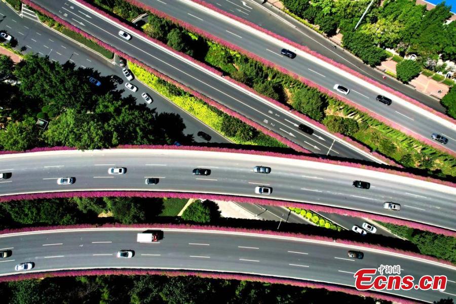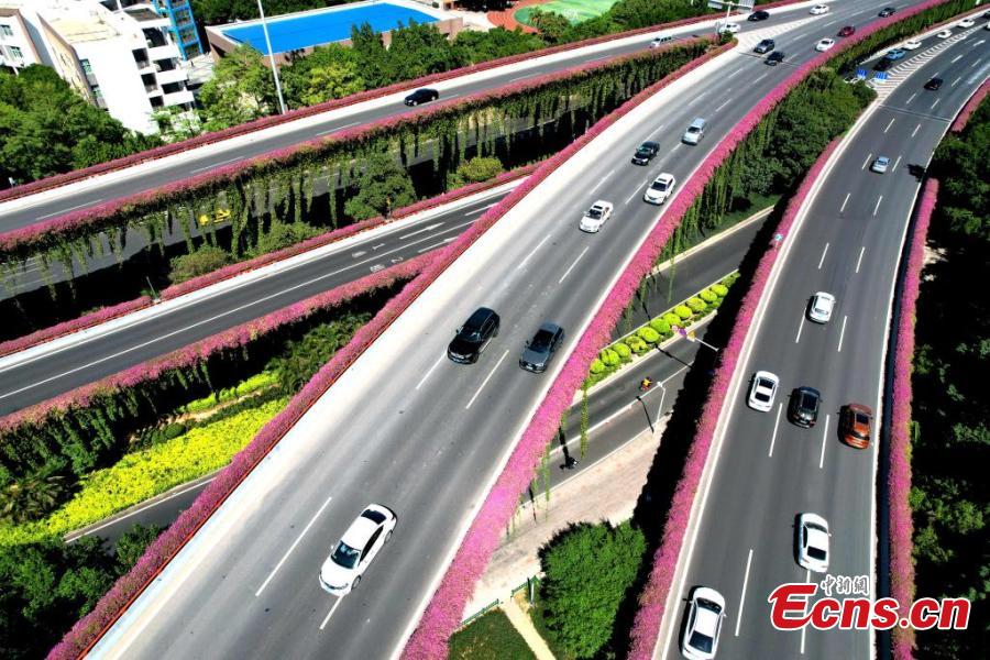 Cars run past blooming Bougainvillea on a viaduct in Fuzhou, east China's Fujiang Province, Oct. 11, 2022. (Photo: China News Service/Wang Dongming)