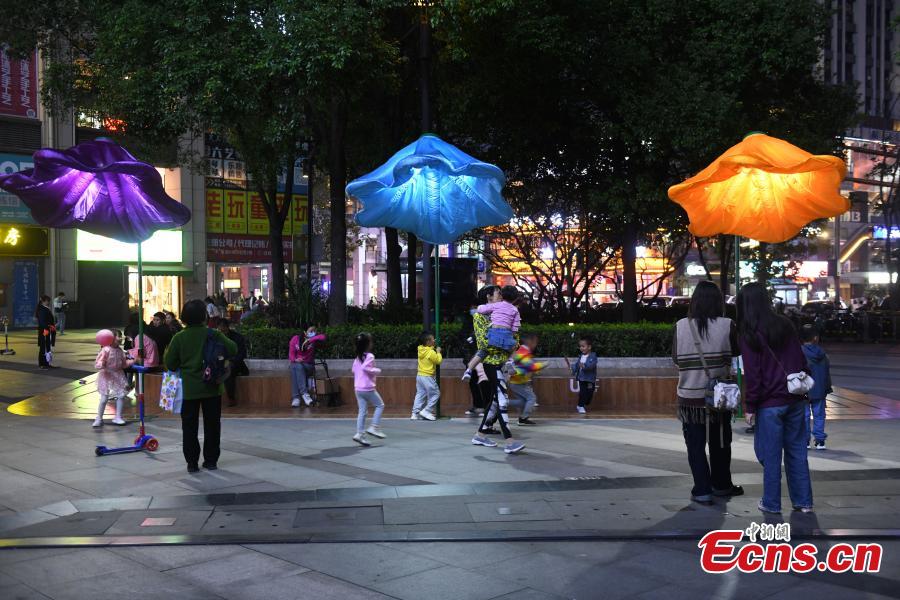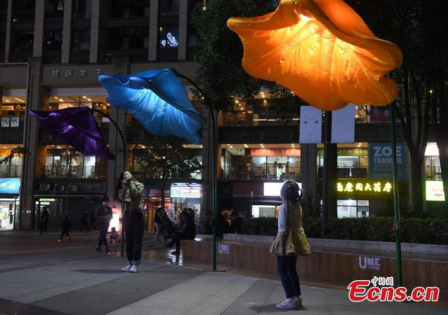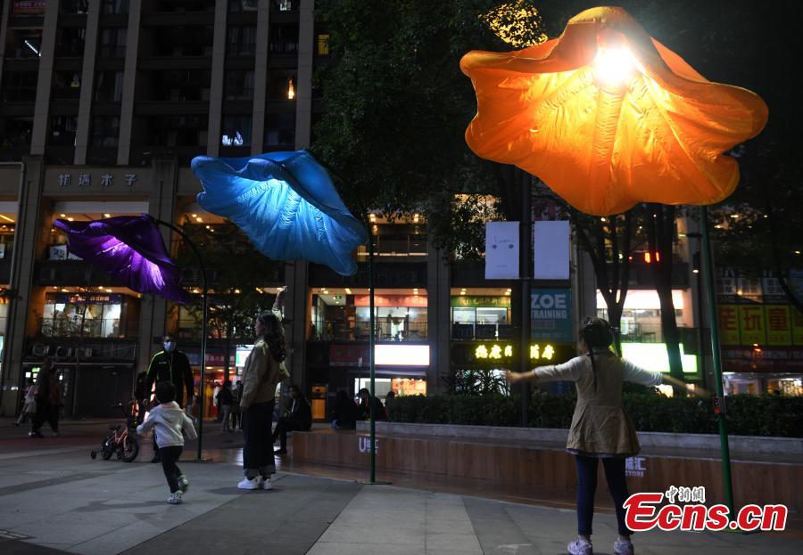 Three flower-shaped street lamps in yellow, blue and purple "bloom" as pedestrians pass by, drawing visitors in Chongqing, Oct. 12, 2022. (Photo: China News Service/Zhou Yi)