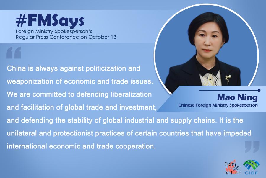 China is always against politicization and weaponization of economic and trade issues. We are committed to defending liberalization and facilitation of global trade and investment, and defending the stability of global industrial and supply chains. It is the unilateral and protectionist practices of certain countries that have impeded international economic and trade cooperation.