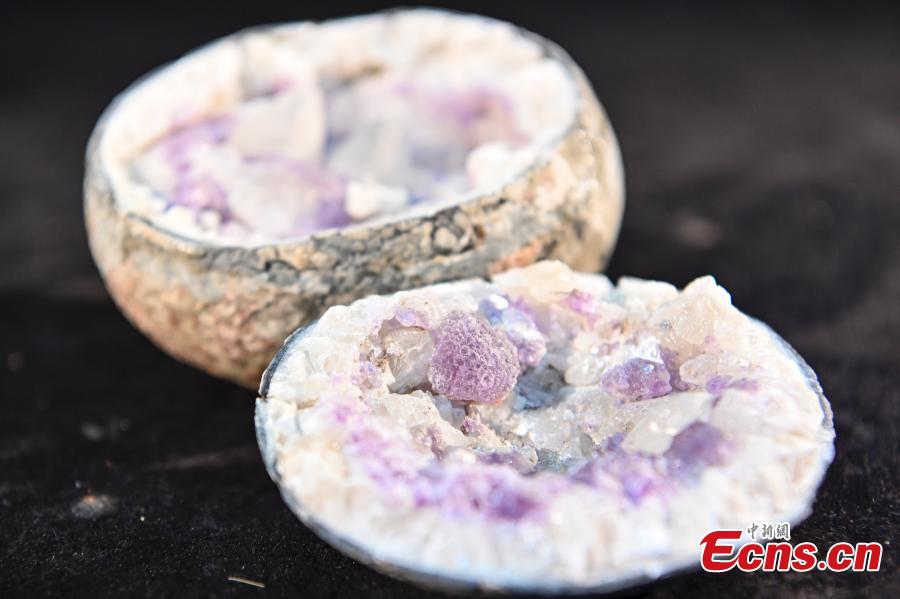 A dinosaur egg with crystals is displayed at the Heyuan Dinosaur Museum, south China's Guangdong Province, Oct. 25, 2022. (Photo: China News Service/Chen Jimin)