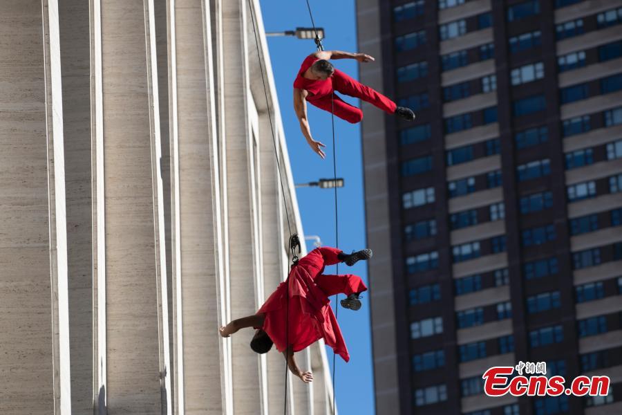 Dancers from Bandaloop perform vertical wall dance on the facade of David Geffen Hall at Lincoln Center during the open house weekend in New York City, New York, the United States, Oct. 29, 2022. (Photo: China News Service/Liao Pan)