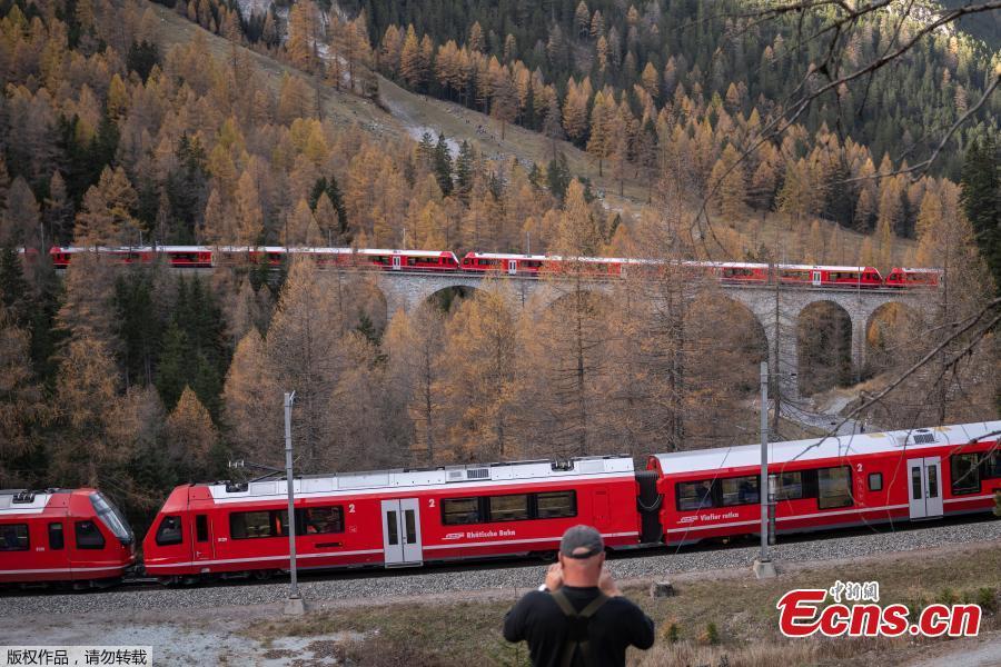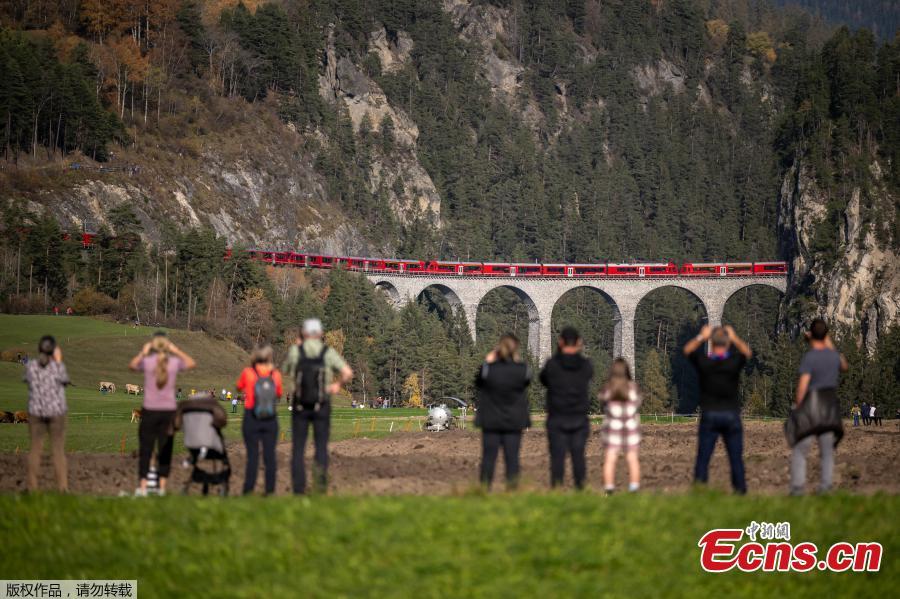 People take photos as a 1910-meter-long train with 100 cars passes near Bergun, Switzerland, Oct. 29, 2022. (Photo/Agencies)