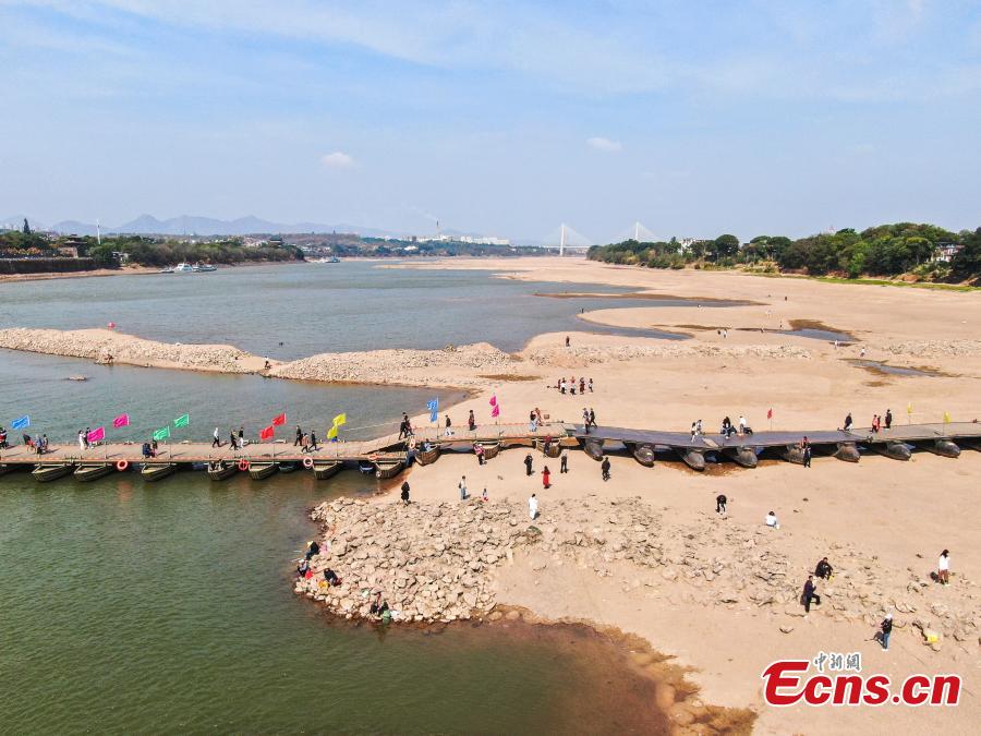 A pontoon bridge sits on the exposed riverbed across the Gongjiang River as the water level dropped in Ganzhou, east China's Jiangxi Province, Oct. 31, 2022.