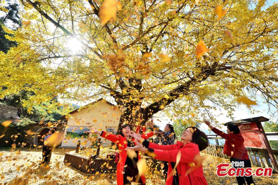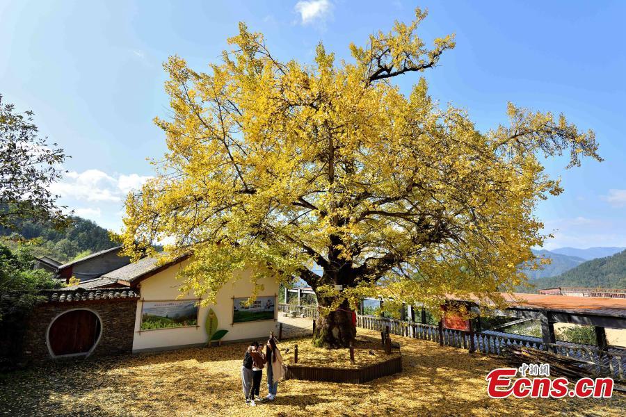 A 1,000-year-old ancient ginkgo tree stands out in a spectacular golden foliage, attracting tourists in Baokang county of Xiangyang, central China's Hubei Province, Oct. 31, 2022. (Photo: China News Service/Yang Dao)