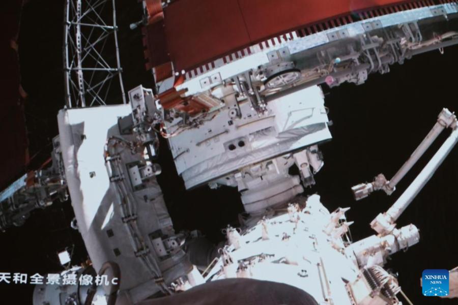 This screen image captured at Beijing Aerospace Control Center on Nov. 3, 2022 shows a view inside Tianhe core module after China's space station lab module Mengtian completed in-orbit transposition. (Photo by Sun Fengxiao/Xinhua)