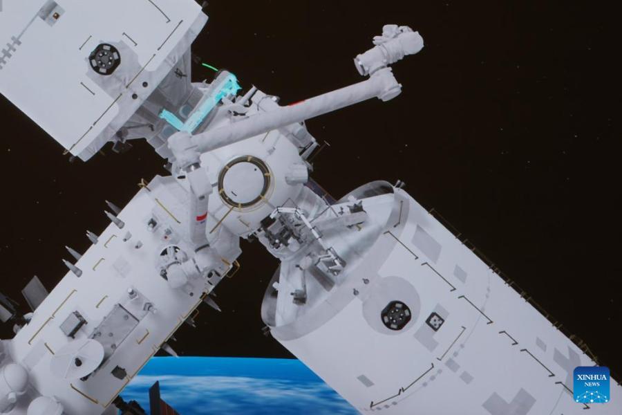 This simulated image captured at Beijing Aerospace Control Center on Nov. 3, 2022 shows China's space station lab module Mengtian after completing in-orbit transposition. (Photo by Sun Fengxiao/Xinhua)