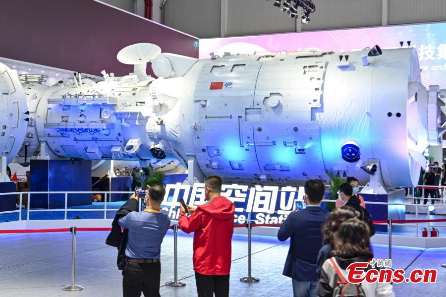 The 1:1 model of the China's space station combination is showcased at Airshow China 2022 in Zhuhai, south China's Guangdong Province, Nov. 6, 2022. (Photo: China News Service/Chen Jimin)