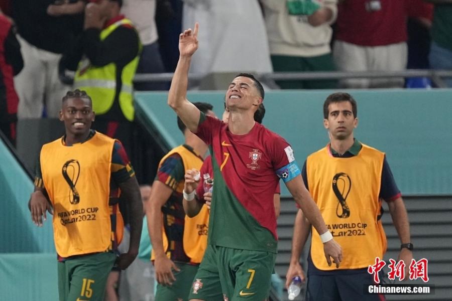 Cristiano Ronaldo of Portugal celebrates scoring his first goal during FIFA World Cup Qatar 2022 Group H match between Portugal and Ghana at Stadium 974 in Doha, Qatar, Nov. 24, 2022. (Photo: China News Service/Cui Nan)