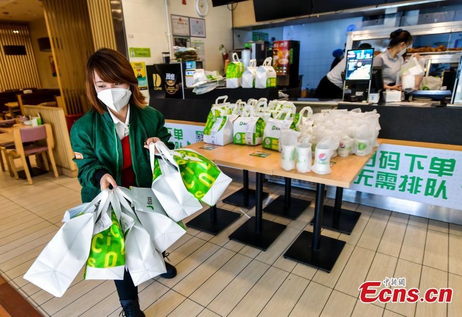 Staff members prepare for food delivery at a restaurant in Urumqi, northwest China's Xinjiang Uyghur Autonomous Region, Nov. 28, 2022. (Photo: China News Service/Liu Xin)