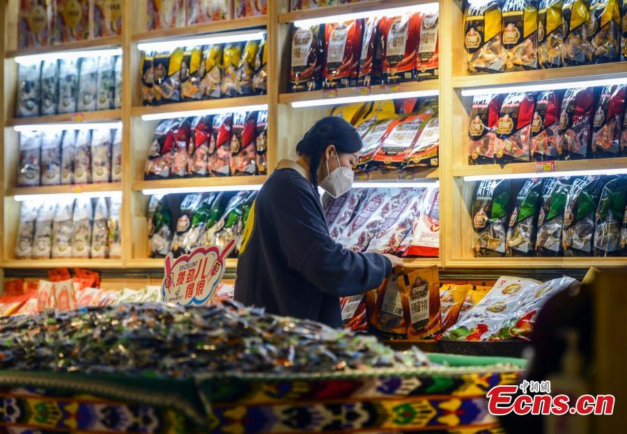 A resident selects products at a store at the Grand Bazaar pedestrian street in Urumqi, northwest Xinjiang Uyghur Autonomous Region, Dec. 4, 2022. (Photo: China News Service/Liu Xin)