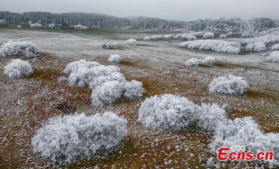 Trees are decorated with rime on Fairy Mountain in Chongqing, turning the mountain range a winter wonderland. (Photo: China News Service/Wang Junjie)