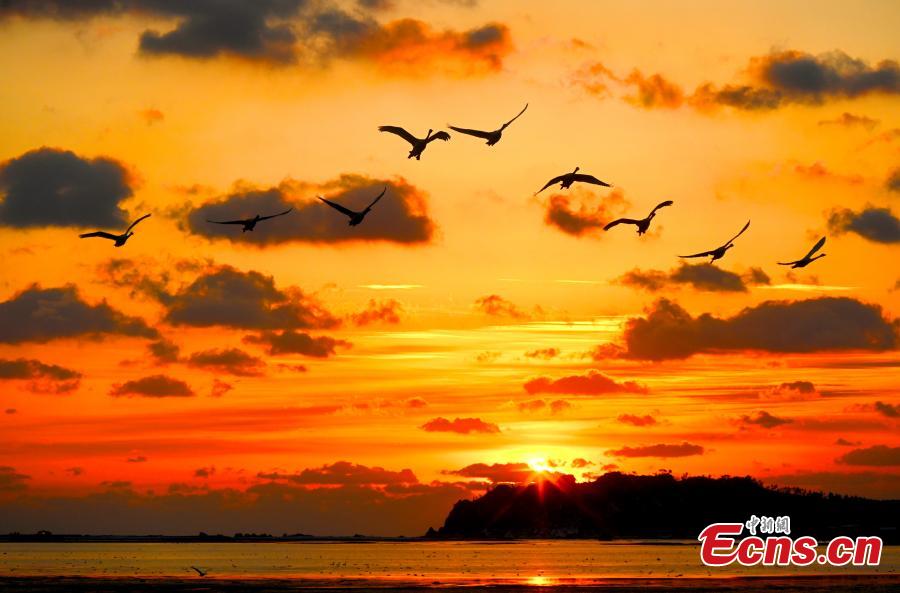 Whooper swans fly in the morning glow at Rongcheng Swan National Nature Reserve in Weihai, east China's Shandong Province, Dec. 5, 2022. (Photo provided to China News Service)