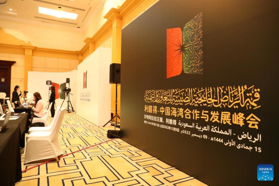 This photo shows a board about the China-Gulf Cooperation Council summit at a media center in Riyadh, Saudi Arabia, Dec. 7, 2022. The first China-Arab States Summit and the China-Gulf Cooperation Council summit will be held in Riyadh. (Xinhua/Sui Xiankai)