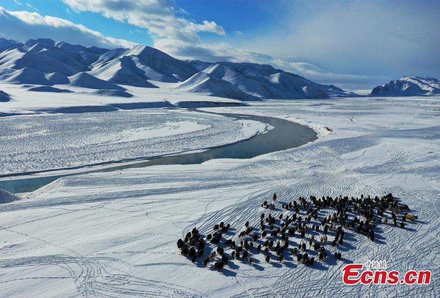 A herd of cattle graze on the snow-covered Bayanbulak grassland in Hejing County, Northwest China's Xinjiang Uyghur Autonomous Region. Snow turns the grassland into winter wonderland. (Photo: China News Service/Wang Fusheng)