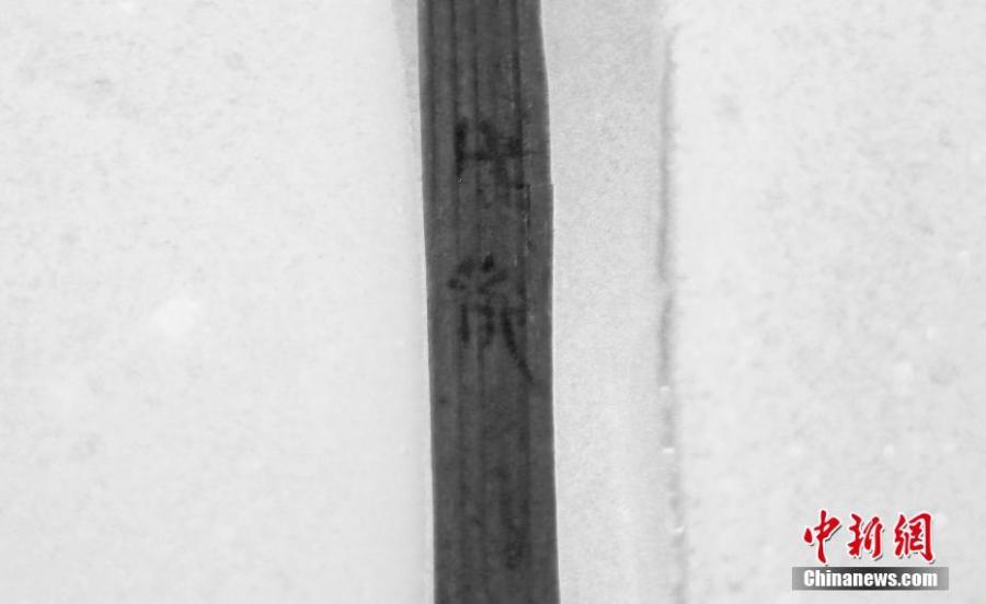 Photo shows a bamboo slip from the Qin Dynasty (221 B.C.-207 B.C.) engraved with the Chinese character "Chengdu" unearthed from the site of Zikujie Street in Chengdu, southwest China's Sichuan Province, Dec. 14, 2022. (Photo: China News Service/An Yuan)