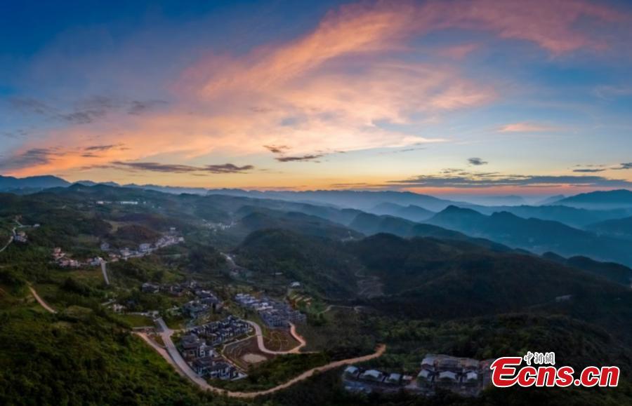 Aerial view shows scenery of Jingzhu Village at sunset in Chongqing, Dec. 20, 2022. (Photo: China News Service/Wang Jinchuan)