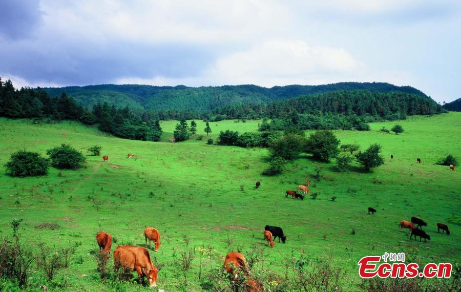 A flock of livestock forage on a grassland in Jingzhu Village, one of the Best Tourism Villages of 2022, in Chongqing, Dec. 20, 2022. (Photo: China News Service/Wang Jinchuan)