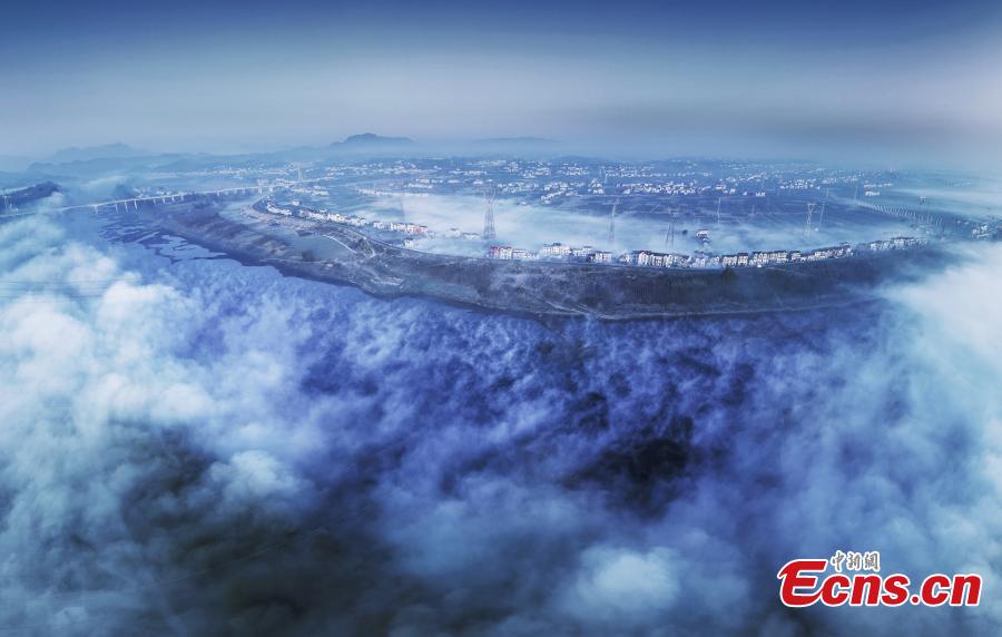 Advection fog shrouds Yidu, central China's Hubei Province, in the morning. The spectacle happens when the wind blows moist and warm air over a colder surface and cools down. (Photo: China News Service/Cao Lida)