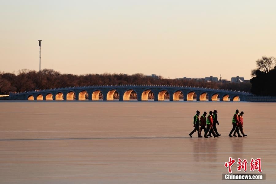 A unique view of "Golden sunset shining through the Seventeen-arch Bridge" at the Summer Palace in Beijing, Dec. 22, 2022, this year's Winter Solstice. (Photo: China News Service/Han Haidan)