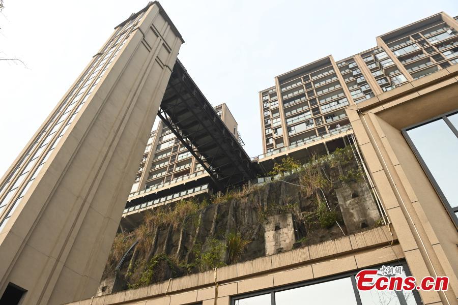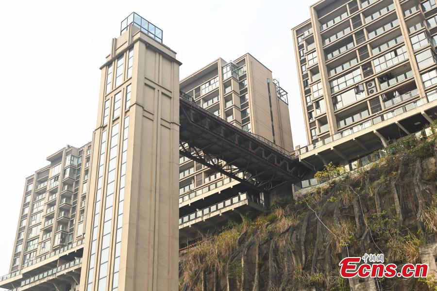 An outdoor elevator is stalled on the mountain side of residential buildings in Chongqing, Dec. 23, 2022. (Photo: China News Service/Chen Chao)