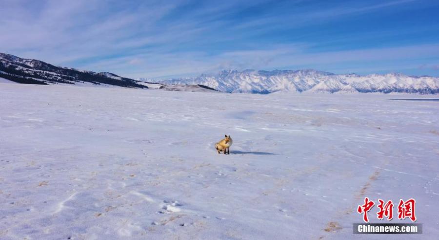 A fox stands on the frozen surface of Sayram Lake in Bortala Mongol Autonomous Prefecture, northwest China's Xinjiang Uyghur Autonomous Region. (Photo provided to China News Service)