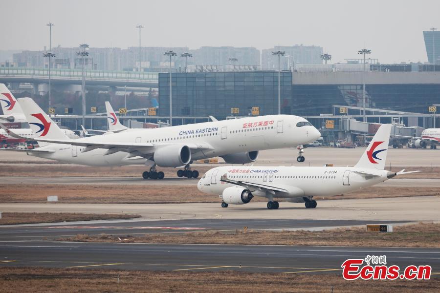 The world's first C919, China's home-grown large passenger aircraft, taxies on a taxiway for its 100-hour test flight at Shanghai Hongqiao International Airport, Dec. 26, 2022. (Photo: China News Service/Yin Liqin)