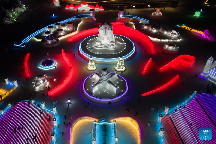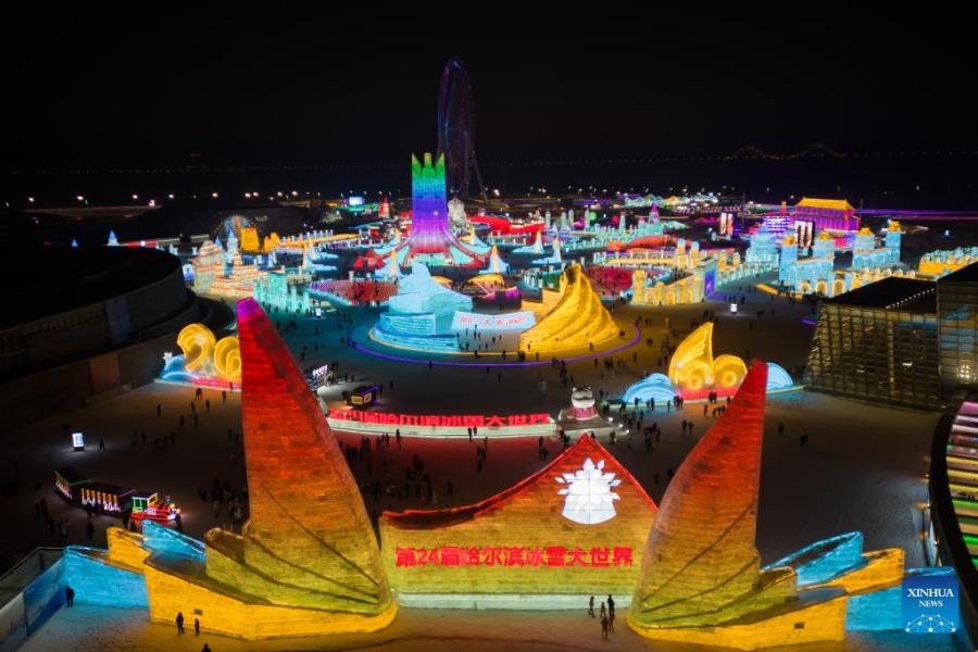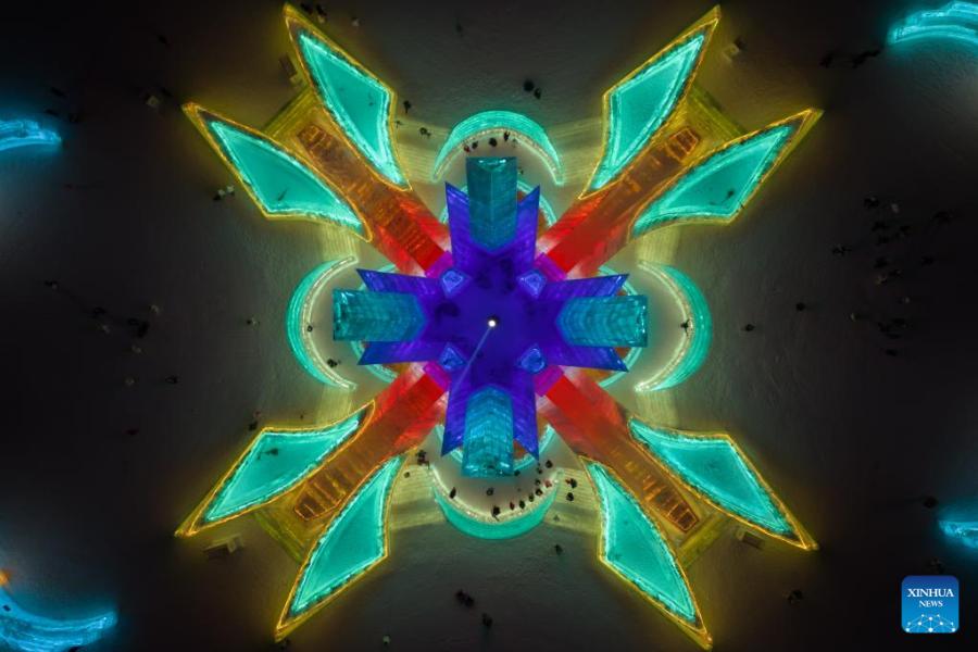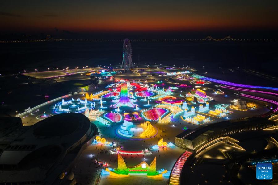 This aerial photo taken on Dec. 31, 2022 shows tourists visiting the Harbin Ice-Snow World in Harbin, northeast China's Heilongjiang Province. (Xinhua/Zhang Tao)