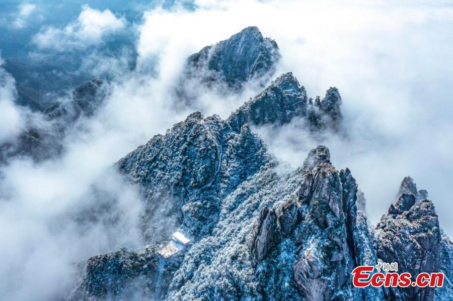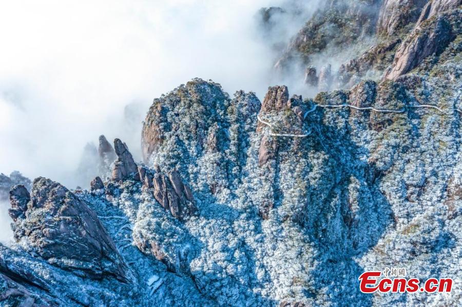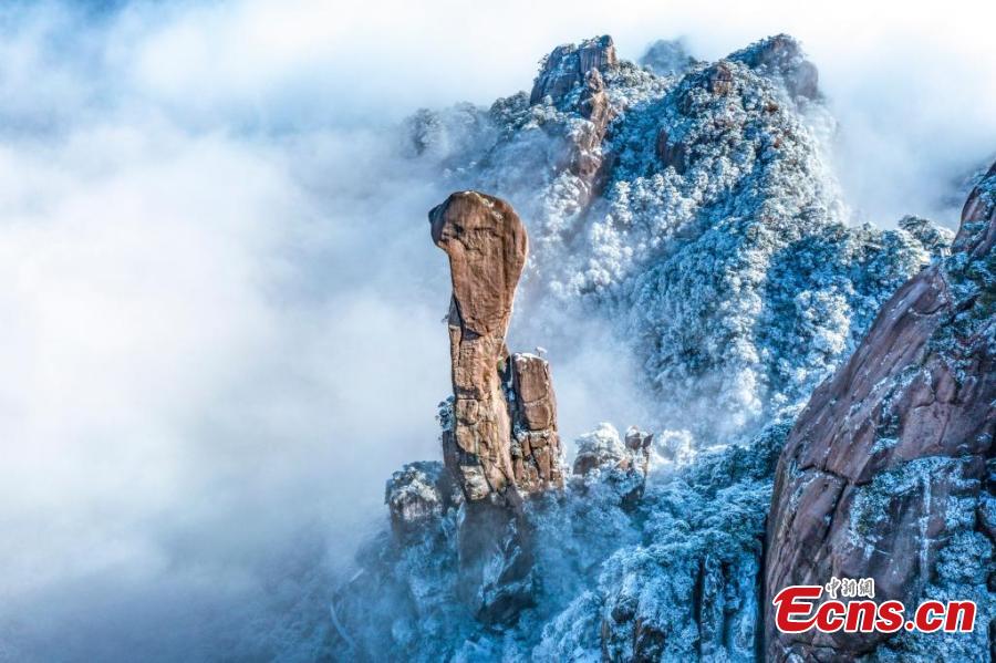Fantastically shaped pillars, peaks and pine trees are blanketed with white snow and rime, creating a fairylike landscape on Sanqing Mountain, a World Heritage Site, Jan. 16, 2023. (Photo: China News Service/Zhan Donghua)
