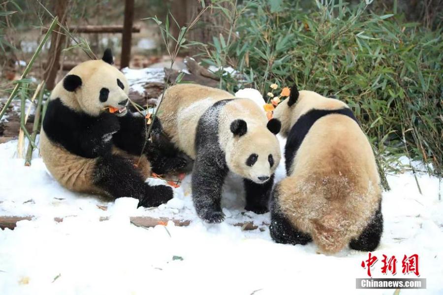 Giant pandas enjoy food made of made of carrot, apple and pumpkin on the snow-covered enclosure at the Chengdu Research Base of Giant Panda Breeding in southwest China's Sichuan Province, Jan. 17, 2023. (Photo provided to China News Service)