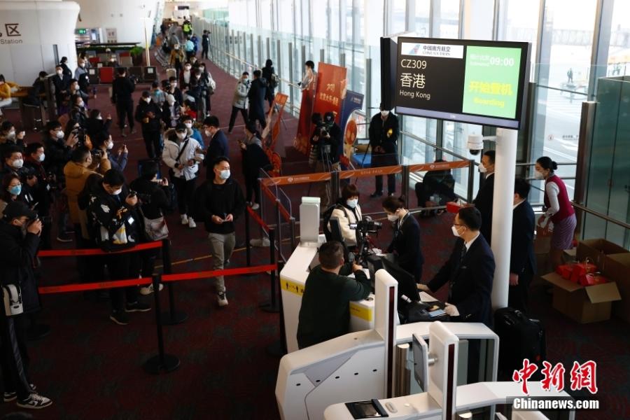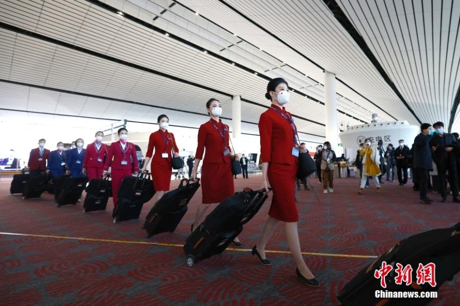 Crew members board flight CZ309 to Hong Kong, the first cross-border flight departing from Beijing Daxing International Airport, Jan. 17, 2023. (Photo: China News Service/Fu Tian)