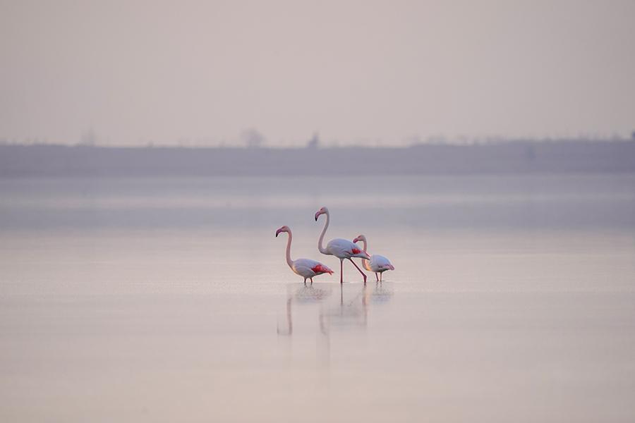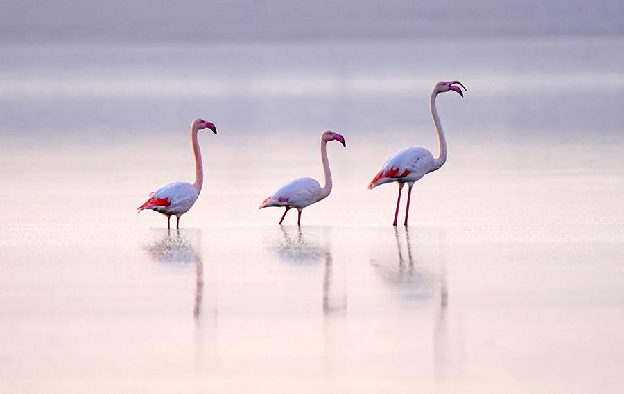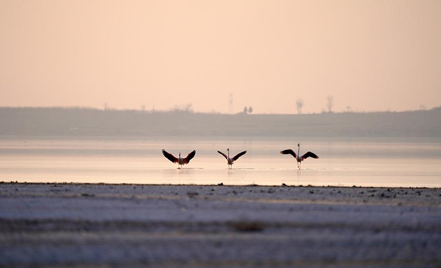 With the improvement of ecological environment, wild flamingos fly to the salt lake to overwinter in Yuncheng every year.