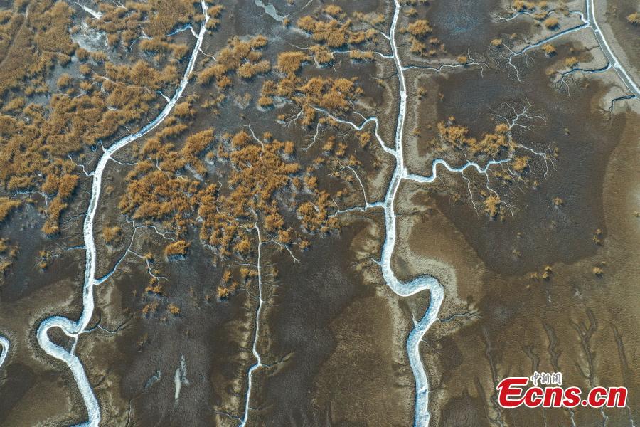Frozen seawater stretches on riverbed of Liaohe river, creating a tree-shaped landscape in Panjin, northeast China's Liaoning Province, Feb. 6, 2023. (Photo: China News Service/Yu Haiyang)