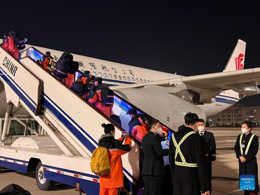 Members of a Chinese rescue team are seen before departing for Türkiye at Beijing Capital International Airport in Beijing, capital of China, Feb. 7, 2023. A Chinese rescue team departed from Beijing for Türkiye on a chartered plane on Tuesday afternoon to join earthquake relief efforts in the country.