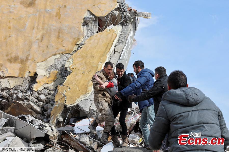 A child is carried out by a rescuer from the site of a damaged building, following an earthquake in Hatay, Türkiye, Feb. 7, 2023. (Photo/Agencies)