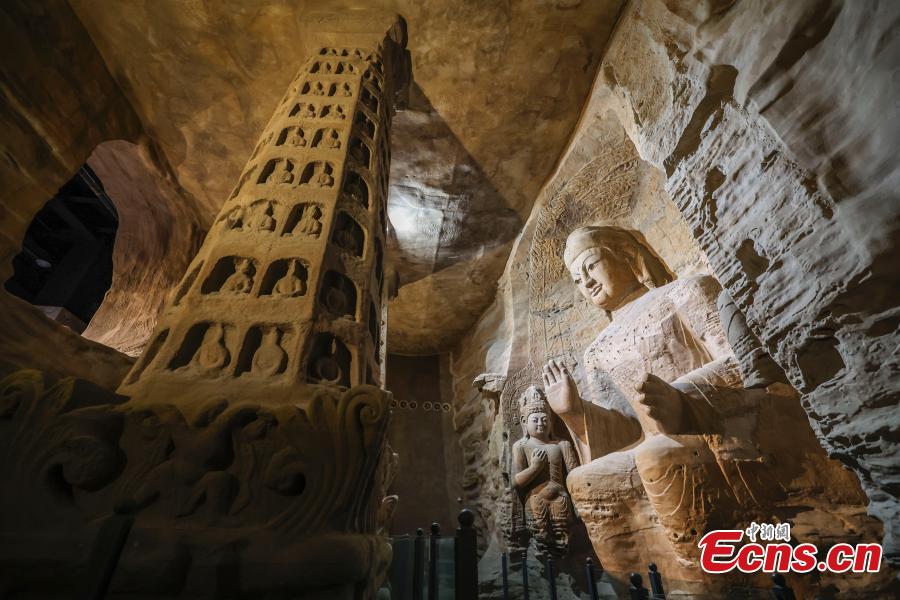 A 3D printed replica of Cave No. 3 in the Yungang Grottoes shows a 9.93-meter-high Buddhist statue exhibited in Qingdao, east China's Shandong Province, Feb. 13, 2023. (Photo provided to China News Service)