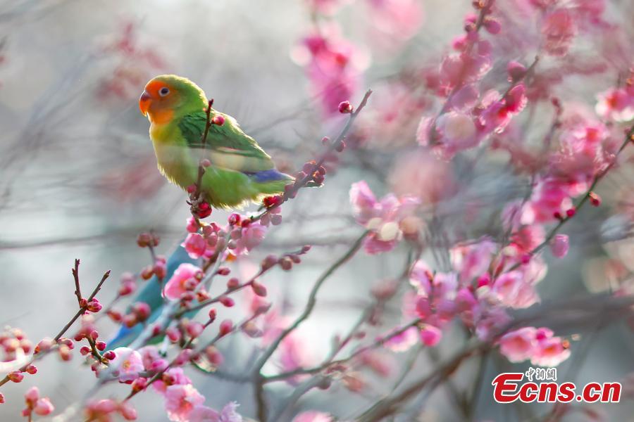 A pair of parrots raised by a Nanjing citizen perch on a branch of blossoming plum tree at the Meihuashan (Plum Blossom Hill) scenic area in Nanjing, east China's Jiangsu Province, becoming part of the beautiful scenes, Feb. 20, 2023. (Photo: China News Service/Yang Bo)