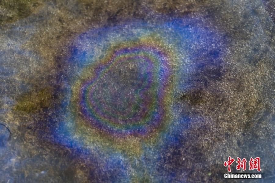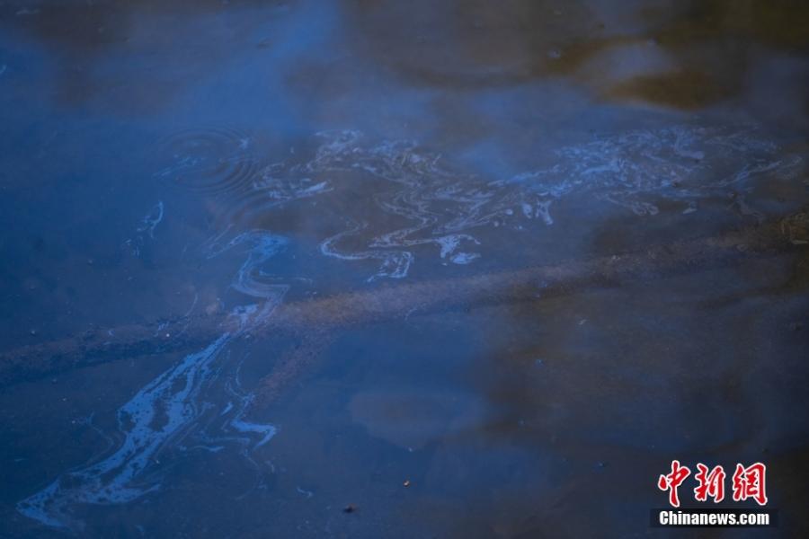 Toxic chemicals float on the surface of Leslie Run creek in East Palestine, Ohio, U.S., Feb. 24, 2023. (Photo/VCG)