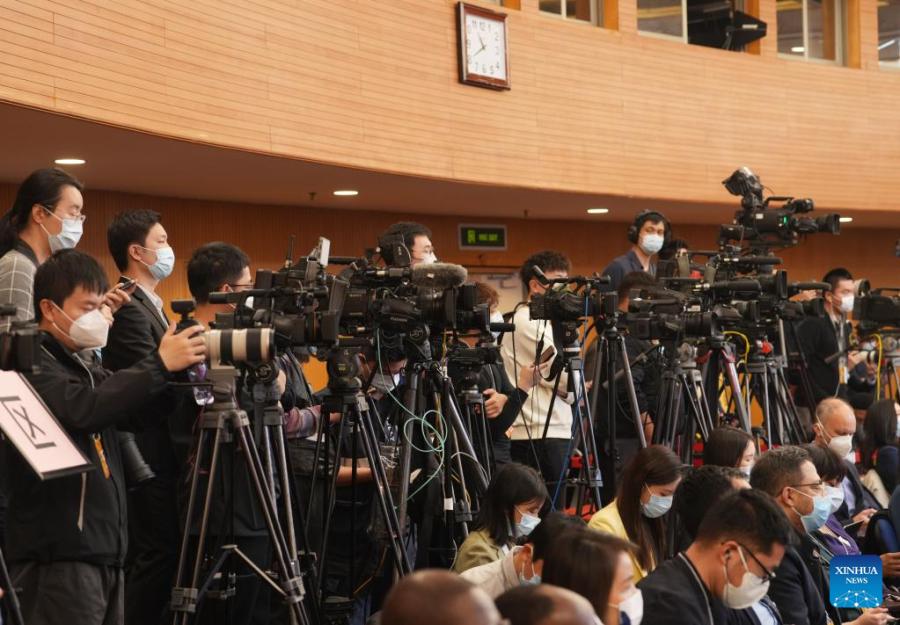 Journalists work at a press conference attended by Chinese Foreign Minister Qin Gang on China's foreign policy and foreign relations on the sidelines of the first session of the 14th National People's Congress (NPC) in Beijing, capital of China, March 7, 2023. (Xinhua/Cai Yang)