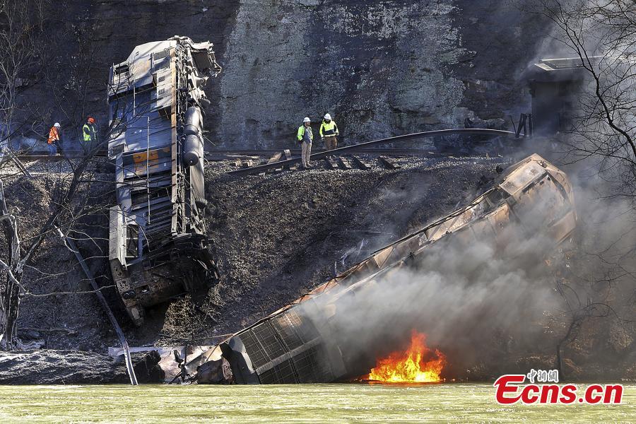 Smoke fills the sky after an CSX freight train hit a rockslide along tracks in a remote area, causing a fiery derailment, West Virginia, U.S., March 8, 2023. (Photo/VCG)