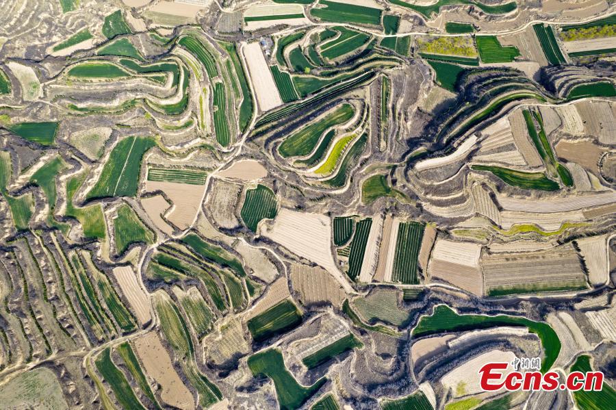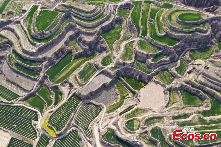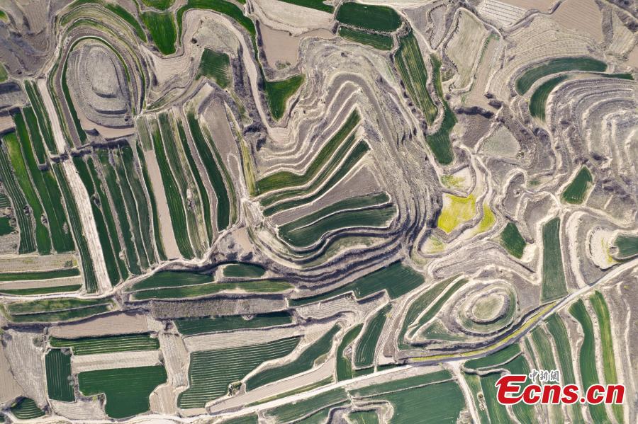 Crops decorate the terraced fields on loess plateau with green and yellow colors in Yuncheng, north China's Shanxi Province, March 28, 2023. (Photo/VCG)