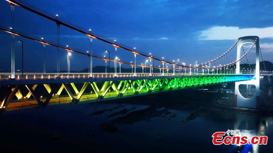 With a main span of 720 meters, the 1,403.8-meter-long bridge completed installation of its illumination system on Tuesday.