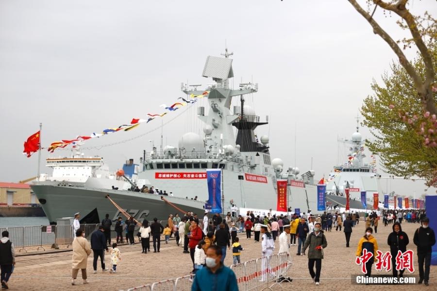 Battleships, including the guided-missile destroyer Kaifeng, the guided-missile frigate Daqing, the comprehensive supply ship Kekexilihu, and the comprehensive submarine rescue ship Hongzehu, in active service were displayed in Qingdao.