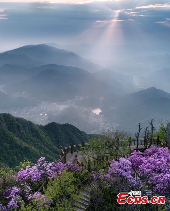 Azalea flowers are in full bloom on a cloud-enveloped mountain in Anji County, east China's Zhejiang Province, April 29, 2023. (Photo provided to China News Service)