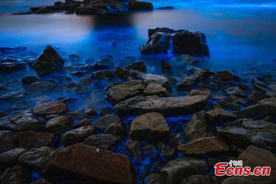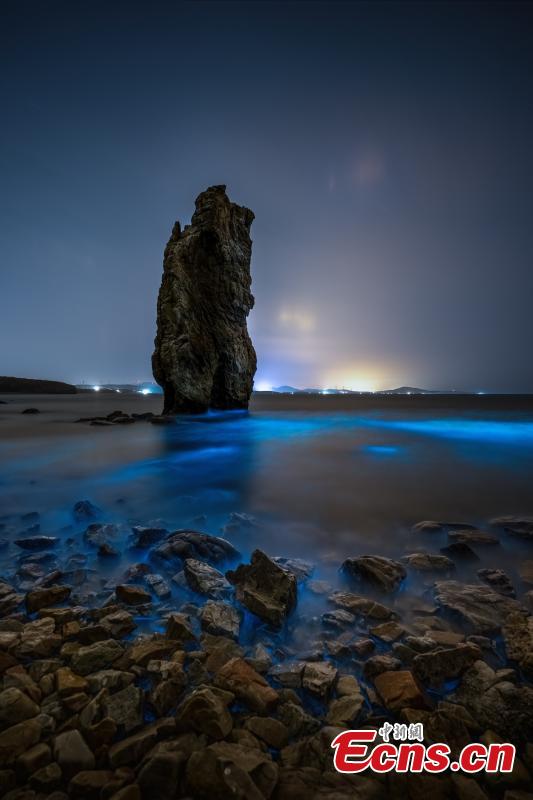 Fantasy scenery of fluorescent sea near Paishi Village of Dalian, northeast China's Liaoning Province. The fluorescent sea is caused by noctilucent algae in the water. (Photo/ICphoto)