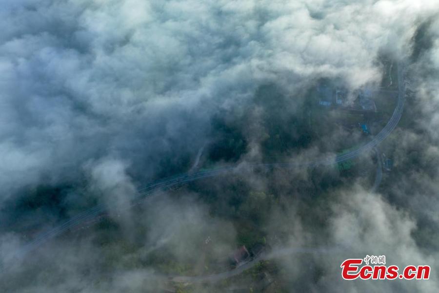 Aerial view of could-shrouded Wawushan expressway, a section of the provincial highway 308 in Hongya County, southwest China's Sichuan Province, April 27, 2023. (Photo: China News Service/Liu Zhongjun)